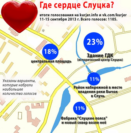 Думаем, 1105 случчан, ответивших на вопрос, могут отразить картину в целом, какое место жители Слуцка считают сердцем города (отметим, что реально проголосовавших больше — на vk.com/kurjer и после 15 сентября продолжали голосовать, однако существенно эти голоса картины не изменили).