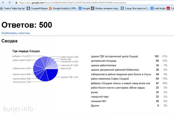 Скриншот страницы Drive.Google для infokurjer. На утро 16 сентября через сайт kurjer.info проголосовало ровно 500 человек. На vk.com/kurjer эта цифра составила 605 человек. Исходя из этих данных и вёлся подсчёт.