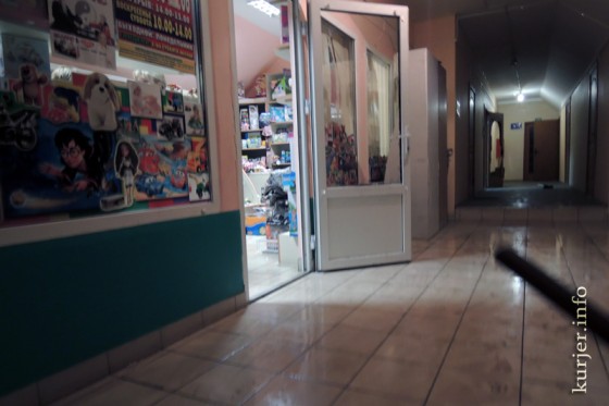 22.30. На втором этаже. На полу видна вода. Стекло в двери магазина выбито. Чьё-то хулиганство привело к тому, что пострадали невинные люди — и материально, и морально. Магазин детских игрушек получил, вероятно, наибольший ущерб. А ведь он, по отзывам жителей этой части города, является очень хорошим магазином. Фото: Алесь Достанко