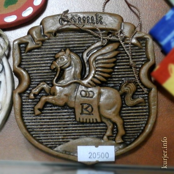 Универмаг «Слуцк», например, предлагает сувенирные кружки, магниты, подвески и значки. Значок с изображением герба города напоминает запонки и стоит 15 850 рублей. Небольшая подвеска с гербом города стоит 20 500 рублей.