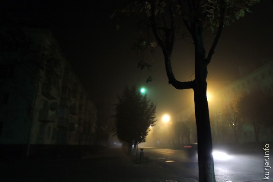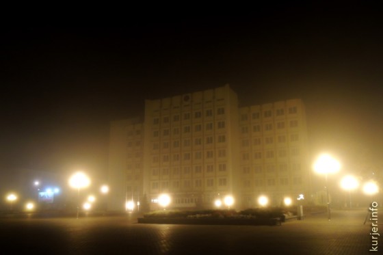 Ночь, туман, вид на городскую площадь и здание Слуцкого райисполкома. Фото: Алесь Достанко