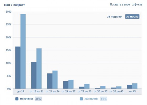 График, показывающий возраст и пол читателей страницы (за месяц, однако примерно такие же показатели наблюдались и в течение прошлых периодов).