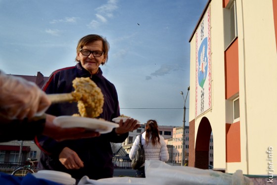 Подходили горожане и за добавкой. А иные, живущие в домах недалеко, даже уносили тарелочку с кашей домой. Покушать пришли даже продавцы одного из близлежащего магазина. Фото: Алесь Достанко
