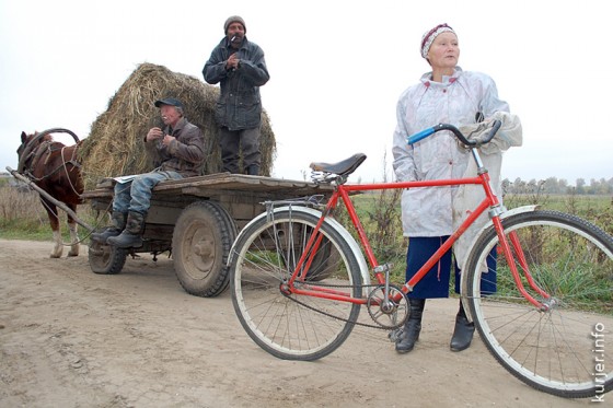 10 октября. Деревня Болотчицы, встреча на дороге. Солигорчанка едет за удобрениями для цветов, а двое случчан на телеге направляются на работу в район Сахарного завода. Фото: Виктория Капская