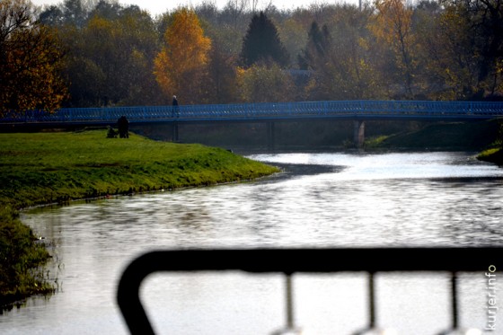 22 октября. Ранее «Чёртов мост» был покрашен в синий цвет, а на другом краю набережной мост возле гимназии №1 — в зелёный. Можно сказать — в основные цвета герба и флага Слуцка и Слуцкого района. Фото: Алесь Достанко