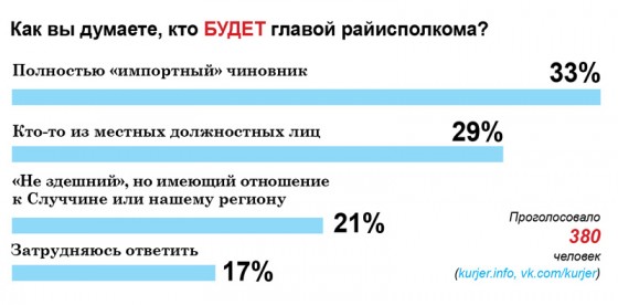 В течение этого времени случчане высказывали свои предположения о новом председателе. Назывались даже три конкретные фамилии, которые якобы рассматриваются в качестве претендентов. Отметим, что часто разговоры ходили вокруг вопроса: местным или «импортным» будет или должен быть глава Случчины.
