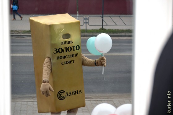 Ростовая кукла в виде золотого слитка зазывала случчан посетить магазин. Фото: Алесь Достанко