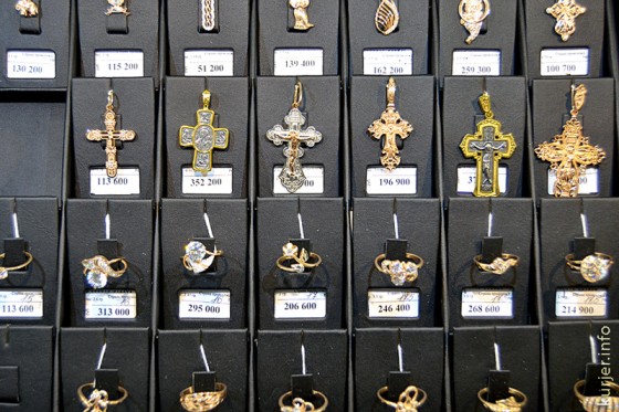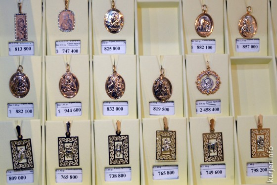 В первый час работы — самый просматриваемый «угол» магазина. К нему в течение первого часа работы магазина было не подступиться. Здесь в витрине выставлены нательные крестики и подвески со знаками Зодиака и ликами Богоматери с младенцем (смотрите также фотографию ниже). Фото: Алесь Достанко