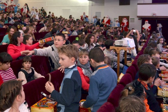 Каждый ребёнок, посетивший праздник, получил новогодний подарок со сладостями. Подарки детишкам раздавали Деды Морозы и Снегурочки, а также почётные гости праздника. Фото: Алесь Достанко