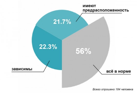 По результатам теста более двух положительных ответов на предложенные вопросы означает, что человек зависим от социальных сетей. Таких среди опрошенных оказалось 22,3%. Два положительных ответа говорят о высокой предрасположенности к этому. В разряд тех, кому стоит задуматься, попали 21,7% голосовавших. О том, как распределились остальные ответы, расскажет инфографика. Всего в голосовании участвовало 184 человека.