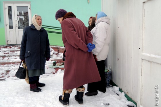 16 января. Пожилые случчанки беседуют, спрятавшись от ветра за остановочным киоском. Район универмага «Крыница». Фото: Алесь Достанко
