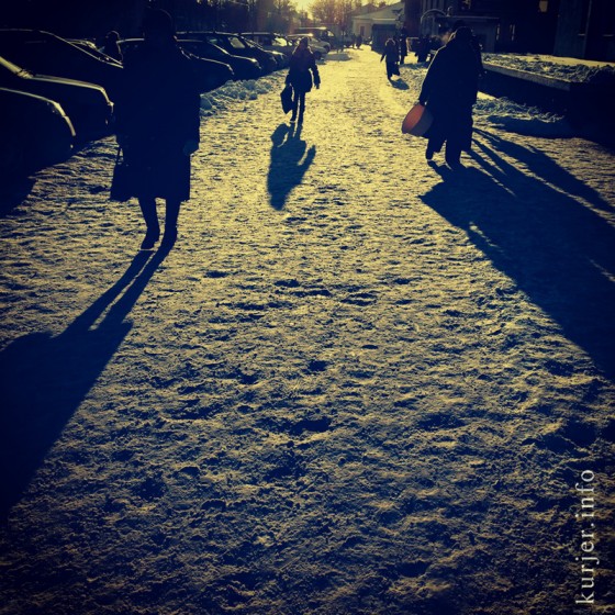 8 января. Утро понедельника. Случчане спешат на работу. Улицы практически не освещена, но на центральной площади ярко светит рекламный экран. Цикл новогодних праздников практически завершён. Фото: Алесь Достанко
