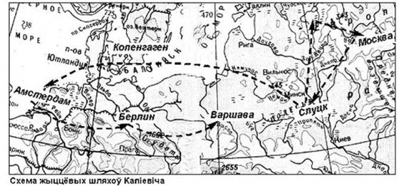 ШЛЯХІ. Жыццёвыя шляхі Капіевіча прайшлі па розных краінах Еўропы. Акрамя Слуцка, у якім ён атрымаў адукацыю, асветнік жыў у Амстэрдаме, Берліне, Варшаве і Маскве. Карта з архіва рэдакцыі
