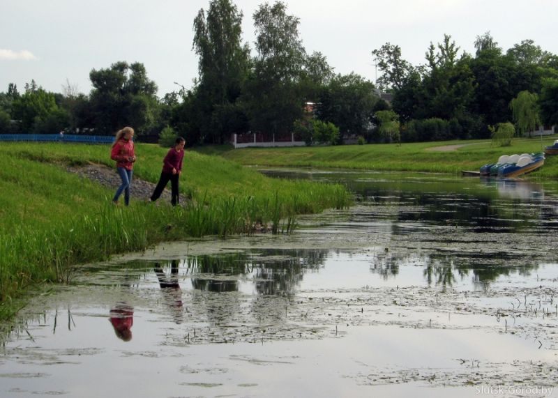 Девочки бросают камни в воду. Слуцк, набережная.