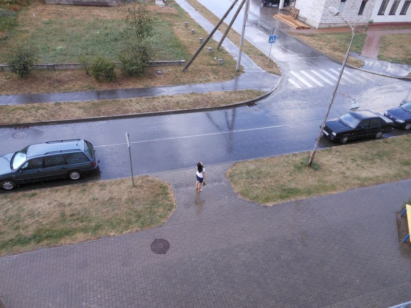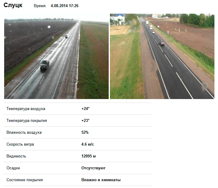 По данным Минтранса, температура воздуха после дождя составила +24°С, температура асфальта +23°С (днём до дождя было +46..48°С), влажность воздуха - 52% (была 8%), скорость ветра - 4,6 м/с, видимость - 12 км. Фото с камер по трассе Р23, Слуцк, р-н МРЭО ГАИ: