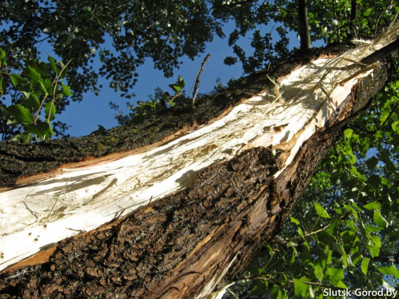 Повреждена кора и отколот кусок древесины на протяжении ствола. Отколотые молнией щепки разлетелись на 10-15 метров.