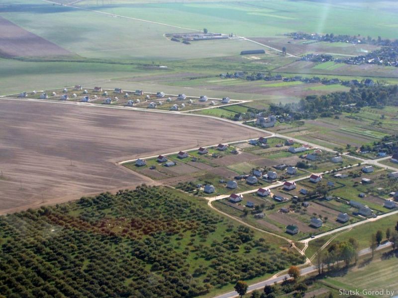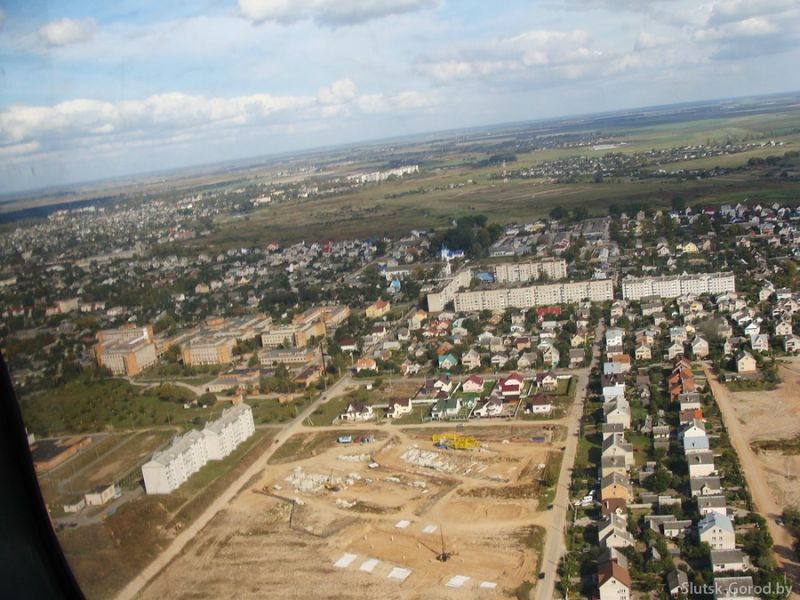 Слуцкая Центральная районная больница, 2-й переулок М.Богдановича. В левом нижнем углу - начало строительства нового микрорайона, закладка фундамента пятиэтажных кирпичных домов, которые уже год как введены в эксплуатацию. Вдалеке можно рассмотреть долину реки Случь, 11 военный городок, деревню Ячево.