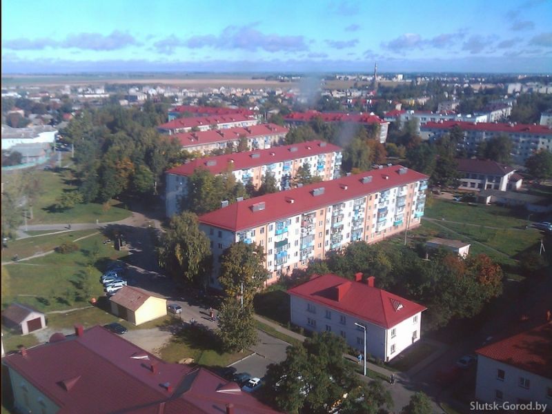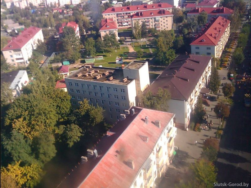 Улица Виленская, в центре снимка: Слуцкий медицинский колледж, новая дорога. В левом верхнем углу фотографии можно рассмотреть улицу Солигорскую и трубу сахарорафинадного комбината. В правой верхней части снимка - автостоянка возле рынка и улица Ленина, уходящая в сторону вокзала и ДСУ-9. В правом нижнем углу: стоянка за городским парком.