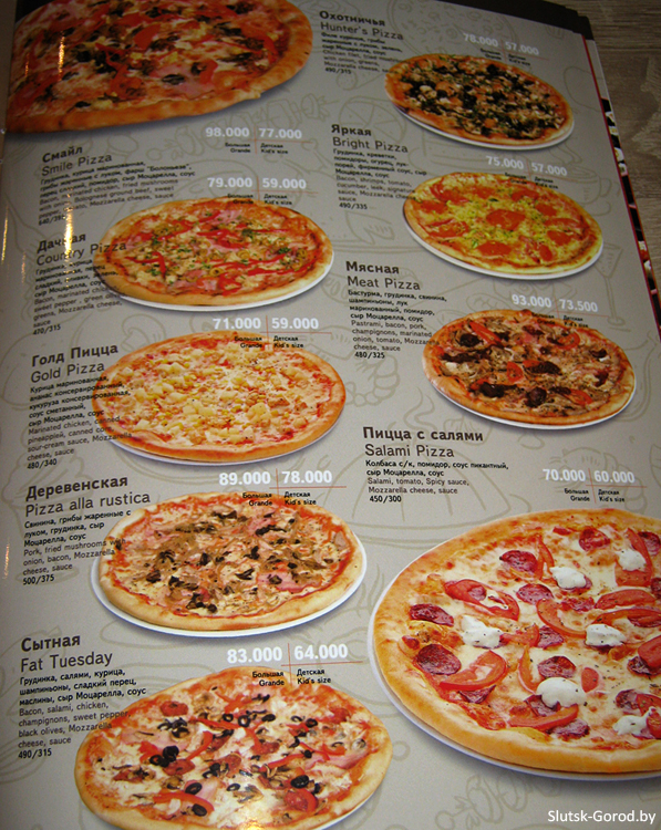 В меню заведения пицца, суши, европейская и белорусская кухня. Цены сопоставимы с другими заведениями Слуцка, при этом они несколько ниже, чем в меню на сайте сети пиццерий «Pizza Smile».