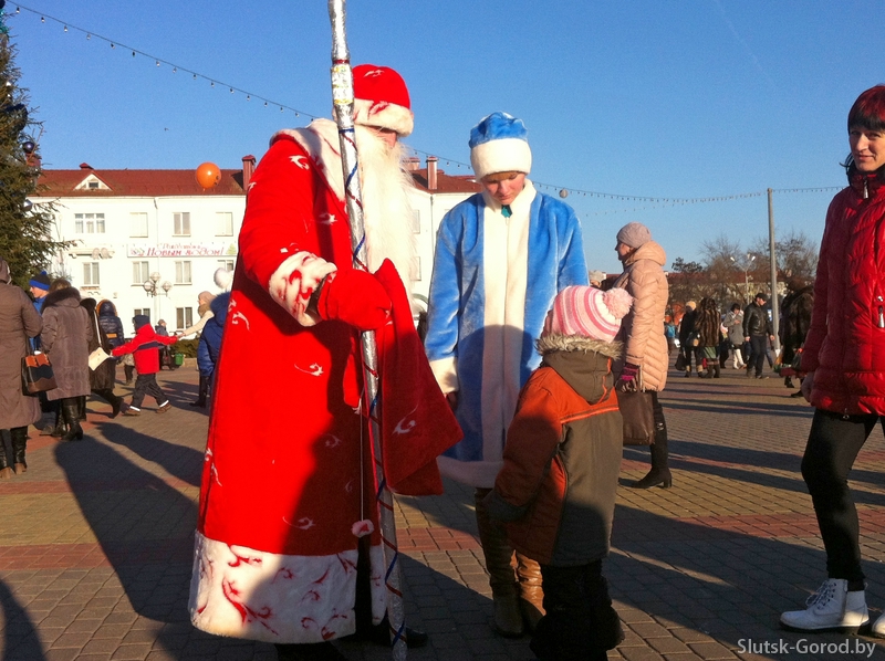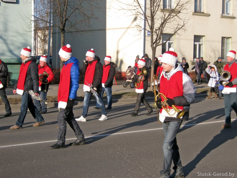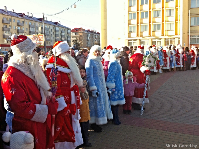 28 декабря в 14:00 в Слуцке началось шествие Дедов морозов. Движение транспорта было ограничено от Молодёжного центра до городского парка: с двух сторон Деды морозы со Снегурочками и другие сказочные персонажи под аккомпанемент духовых и ударных инструментов прошли к центральной городской площади, где началась праздничная программа и концерт. Всего в шествии приняли участие более 100 персонажей.