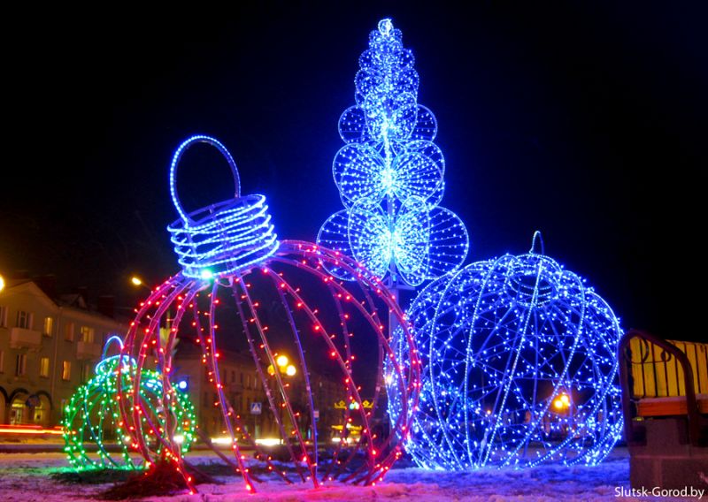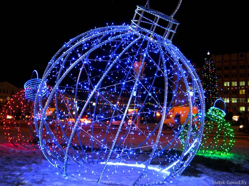 Сегодня в Слуцке впервые зажглись светящиеся новогодние шары - элементы ландшафтного дизайна, новогодняя иллюминация из металлического каркаса, покрытая гирляндами, ставшая особенно популярной в России и Беларуси в преддверии 2015 года.