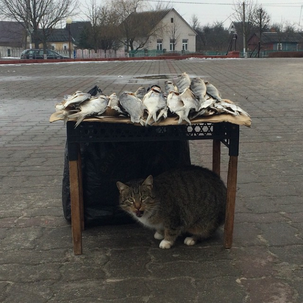 Случчанин с ником @sialenius разместил в своём Instagram фотографию кота, который сидит под уличным прилавком с сушеной рыбой. К фотографии хорошо подходит подпись «Нас и тут неплохо кормят». Фото сделано рядом с магазином «Слуцк-Восток» №21, который в народе называют «21-й универсам»: