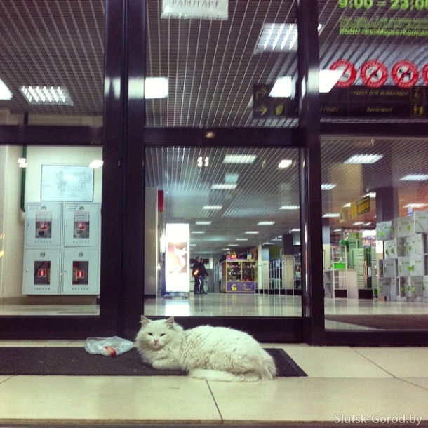 Вечером 19 февраля мы запечатлели кота, который живёт рядом с ТЦ «Маяк», его подкармливают работники центра, рядом с котом лежит пакет с кошачьим кормом и сосиской. Фото @slutskgorod: