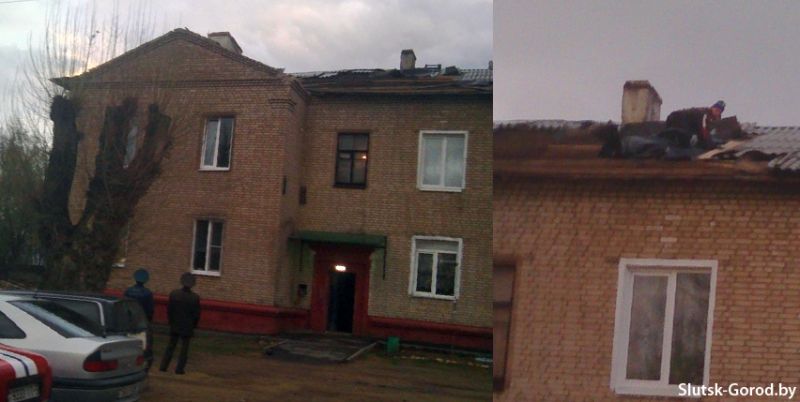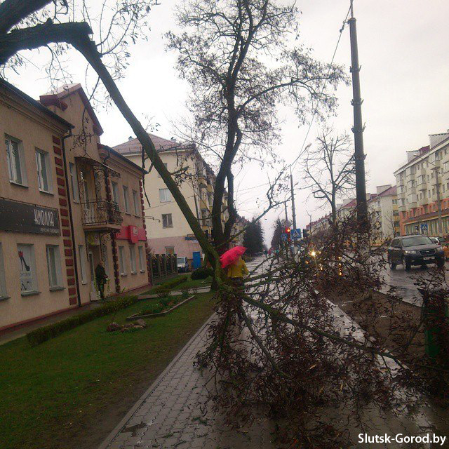 В городе разрушения коснулись в основном кровли жилых домов, рекламных конструкций и деревьев. В городском парке деревьев повалено не было, а вот в самом центре Слуцка несколько деревьев не выдержали сильного ветра.