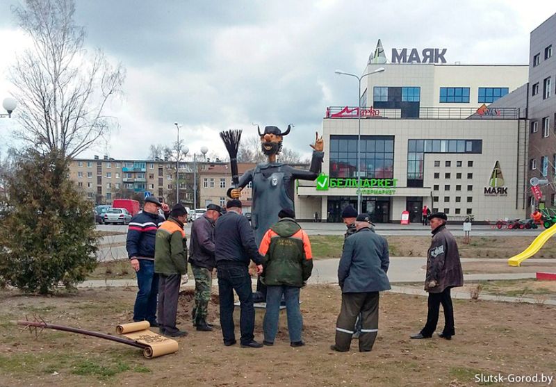 Сегодня в Слуцке, рядом с ТЦ Маяк, установили 2,6-метровую скульптуру дворника, изготовленную на предприятии ООО «Дайла» по заказу Слуцкого ЖКХ. Персонаж один в один напоминает героя советского мультфильма «Падал прошлогодний снег…»