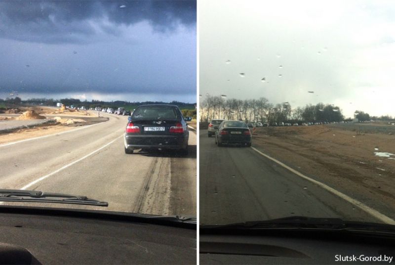 Около 16:00 пробка выстроилась по слуцкой кольцевой дороге до деревни Лучники, часть автовладельцев выезжали к Ленькам и Шищицам по дороге через деревни Молотково и Греск. В 17:20 движение было затруднено на участке трассы от Шишиц до Лучников, но на некоторых участках движение немного нормализовалось. По сообщениям очевидцев, заторы создавались в том числе и в результате торможения потока транспорта перед искусственными неровностями. Пользователи соцсетей сообщали, что дорога от Слуцка до Буда-Гресской, где начинается двухполосное движение, занимала до двух часов.