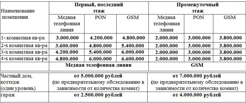 Ориентировочная стоимость оснащения охранной сигнализации (с учетом стоимости оборудования) жилых домов, квартир и других помещений: