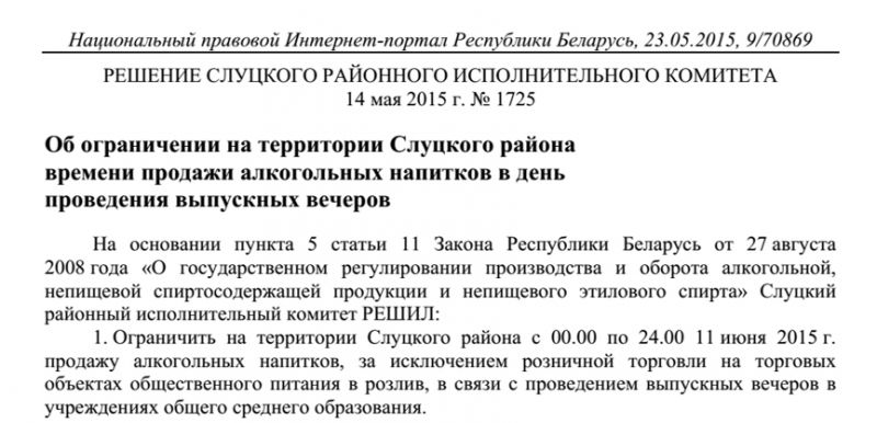 В связи с проведением выпускных вечеров 11 июня в Слуцком районе будет ограничена продажа алкогольных напитков, соответствующее решение Слуцкого райисполкома было опубликовано на Национальном правовом интернет-портале Республики Беларусь.