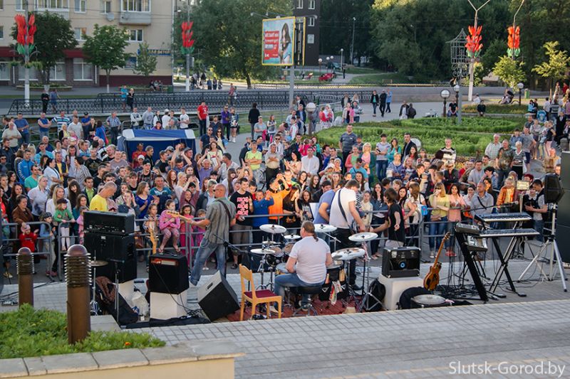 В 20:00 на ступенях ГДК началась концертная программа «День «М», в которой приняли участие три местных коллектива: кавер-бенд «Супер гуд», дебютировавшая в Слуцке группа «Др.Джокер» и "динозавры слуцкого рока" - «Riverstone». На концерте присутствовало несколько сотен зрителей самых разных возрастов.