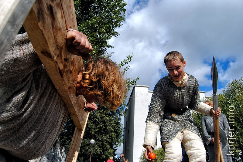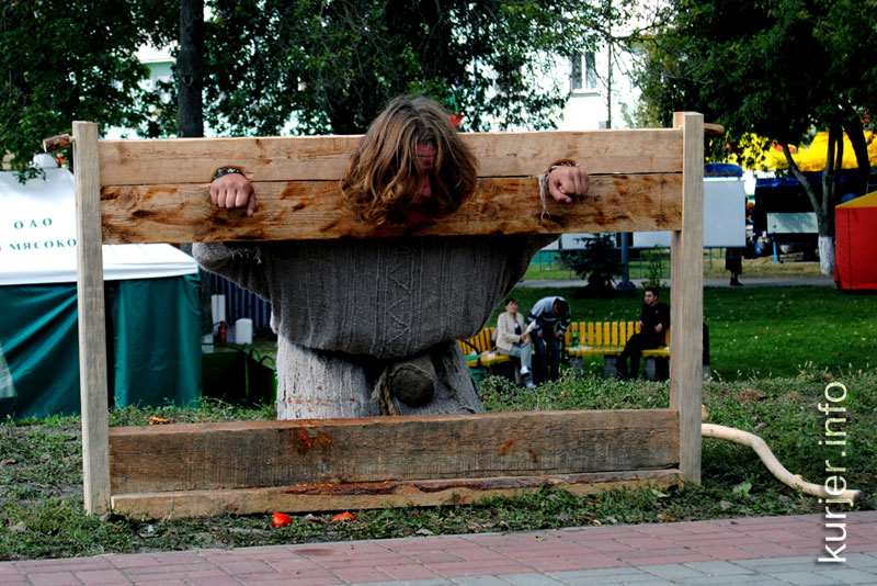 Шатёр, стол с яствами, штандарт с изображением «Серебряного пегаса» и коллектив музыкантов, исполнявших старинную музыку, — таковы были атрибуты реконструкции слуцкого средневековья. В рыцарском лагере зрители увидели фехтование на мечах. Работал и самый «беспощадный» аттракцион праздника: любой желающий за небольшую сумму мог пометать помидоры в закованного в колодки бедняка.