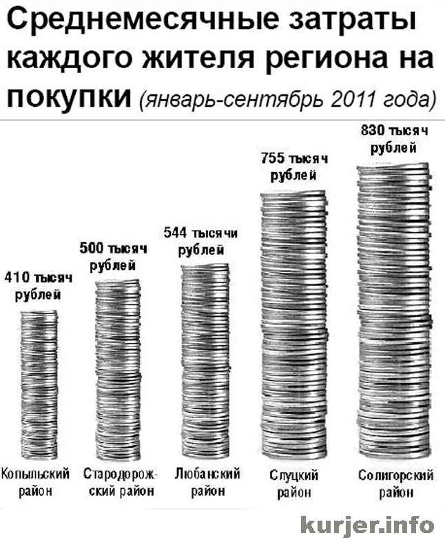 Любанчане жили куда скромнее: на каждого жителя вышло по 4,9 млн. рублей затрат на покупки. Ещё меньше за 9 месяцев потратили жители Стародорожского и Копыльского районов – по 4,5 млн. и 3,7 млн. рублей соответственно.