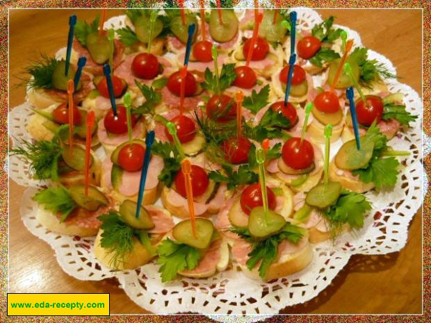 Белый хлеб, сыр, рыба, ветчина, колбаса, маринованный или свежий огурец, грибы, зелень нарезаются одинаковыми геометрическими фигурами – квадратами, ромбами, треугольниками и кругами. Укладываются слоями и продеваются шпажкой, пойдёт и зубочистка. Ингредиенты могут быть в абсолютно разных соотношениях: канапе рыбные, сырные, мясные, овощные, десертные, фруктовые. Кстати, вместо белого хлеба можно использовать чипсы. В общем, включайте фантазию!