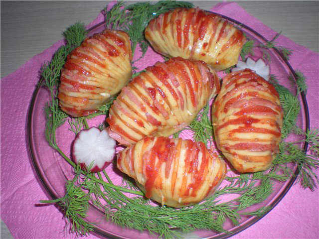 Хорошо вымытый сырой картофель надрежьте вдоль (не доходя до конца) с расстоянием не более 1 см. В эти надрезы вставьте тонко порезанный бекон (колбасу, ветчину, сало – что есть под рукой), чередуя, если желаете, с овощами. Посолите, поперчите, добавьте майонез, заверните в фольгу и поставьте в духовку примерно на 20-30 минут. За три минуты до готовности разверните фольгу и посыпьте тёртым сыром.