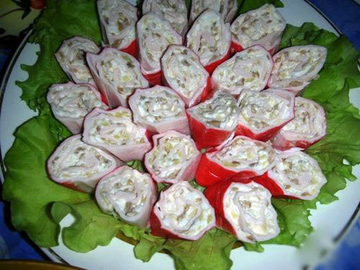 Разморозьте и разверните на листики крабовые палочки. На каждый листик положите начинку и закрутите обратно. Начинки могут быть разные: сыр+чеснок+майонез, вареный рис+яйцо+рыбная консерва+майонез, огурец +вареный рис + майонез, шпротинка + перо лука, кукуруза+майонез+плав-леный сыр. В общем, всё зависит от вашей фантазии. Рулетики положите в морозилку на 30-40 минут, после чего порежьте на небольшие кусочки. Уложите на блюдо пирамидкой.