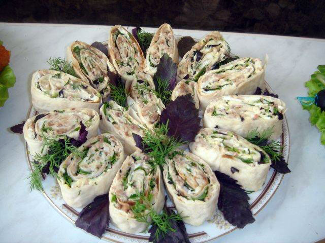 Лист лаваша смажьте майонезом, выложите на него измельчённые вареные яйца. Сверху посыпьте зеленью. Накройте вторым лавашем, смажьте майонезом. Посыпьте мелко нарезанными крабовыми палочками. Сверните в трубочку, заверните в пищевую плёнку – и в холодильник. Начинкой может выступать вареная колбаса, сыр, копчёная рыба, грибы, овощи. Одним словом, всё, что есть под рукой.