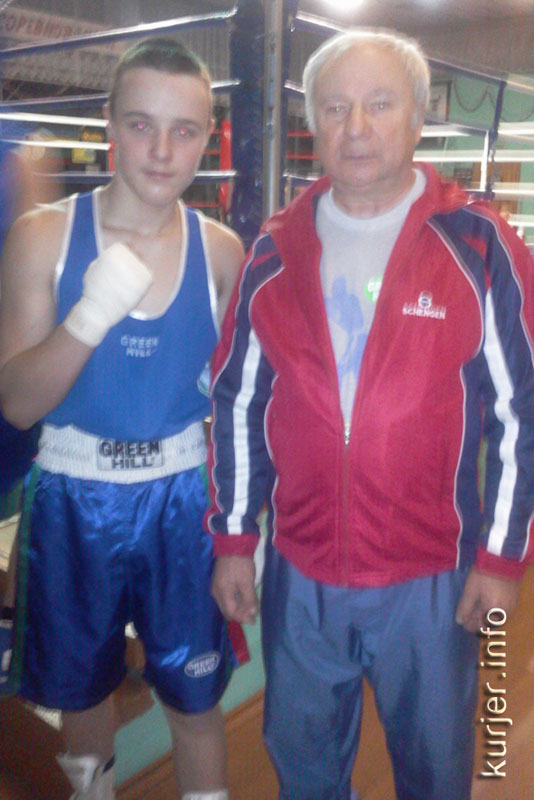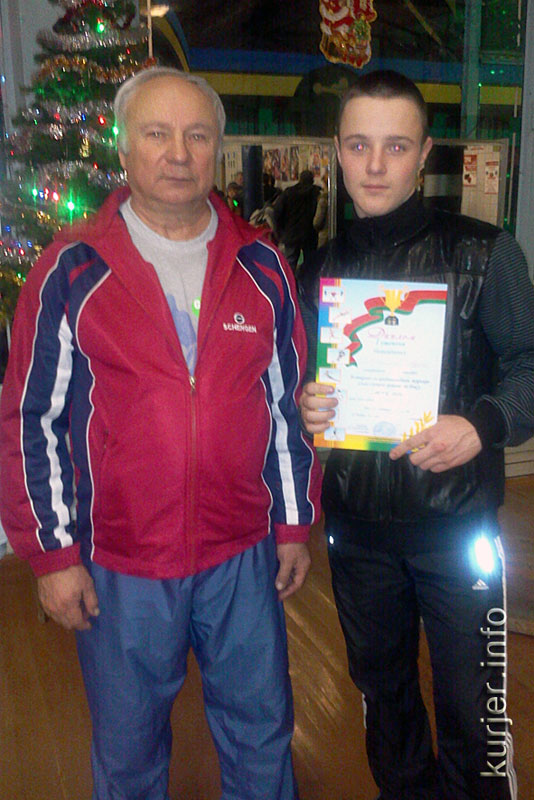 БОКС. Георгий Новиков со своим воспитанником Мартином Мыслицким, который в этом турнире выграл бой досрочно с очевидным преимуществом. Фото: Андрей Мыслицкий Слуцк в турнире представляли семь боксёров. Пятеро из них заняли первые места в своих весовых категориях: Анар Гасанов, Дмитрий Дичковский, Станислав Ваханич, Мартин Мыслицкий и Никита Карпейчик. Вторые места заняли Владислав Кузнецов и Юрий Гурбо. Они награждены дипломами и новогодними подарками. Об этом «ІК» сообщил тренер слуцких боксёров Георгий Новиков, мастер спорта СССР, судья национальной категории. «Хочу поблагодарить родителей, которые обеспечили своим транспортом проезд на соревнования. Заодно поздравляю ребят и их родных с Новым 2012 годом. Желаю быть всегда здоровыми, жизнерадостными, успехов в учёбе. Будьте чемпионами!», — сказал тренер.