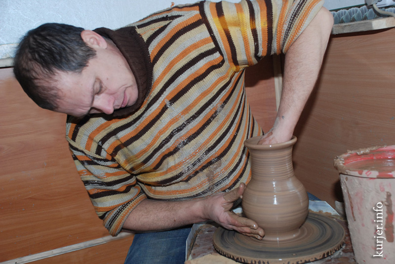 На дзіва спрытныя рукі у Аляксандра Кірычака — кіне на круг камяк гліны і вочавідкі вырастае прыгожы посуд.