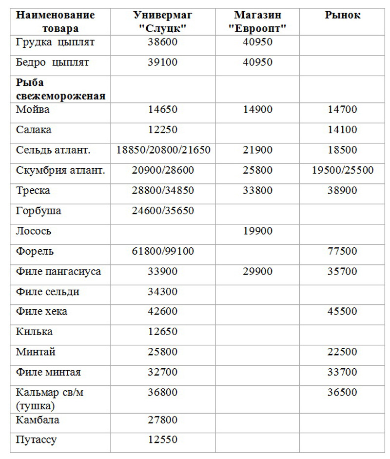 В этот день тушка цыплят в универмаге «Слуцк» и КУП «Восток» стоила 24 800, в «Евроопте» 26 350 рублей за килограмм. Другие цены смотрите в таблицах.