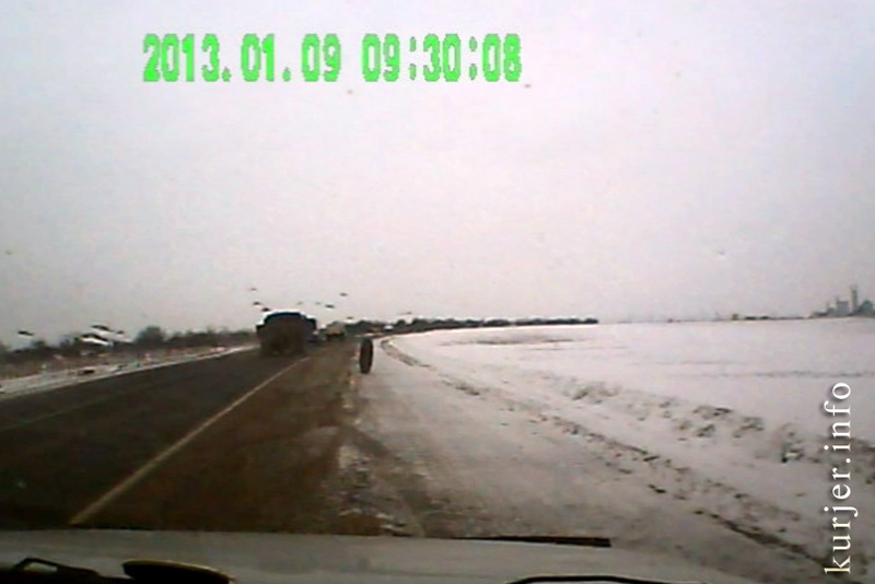 Смотрите сразу за третьей по счёту проезжающей машиной... Утро, 9 января. Окраина Слуцка. Видеорегистратор Инны Шилович зафиксировал, как за потоком машин неожиданно по дороге одиноко покатилось колесо — прямо в заснеженное поле. К счастью, колесо не стало причиной ДТП с заметными последствиями. Далее на видео зафиксировано, как двое мужчин, которые, предположительно, и потеряли колесо на ходу, идут вдоль дороги в поисках пропажи. На обочине стоит, вероятно, их автомобиль.