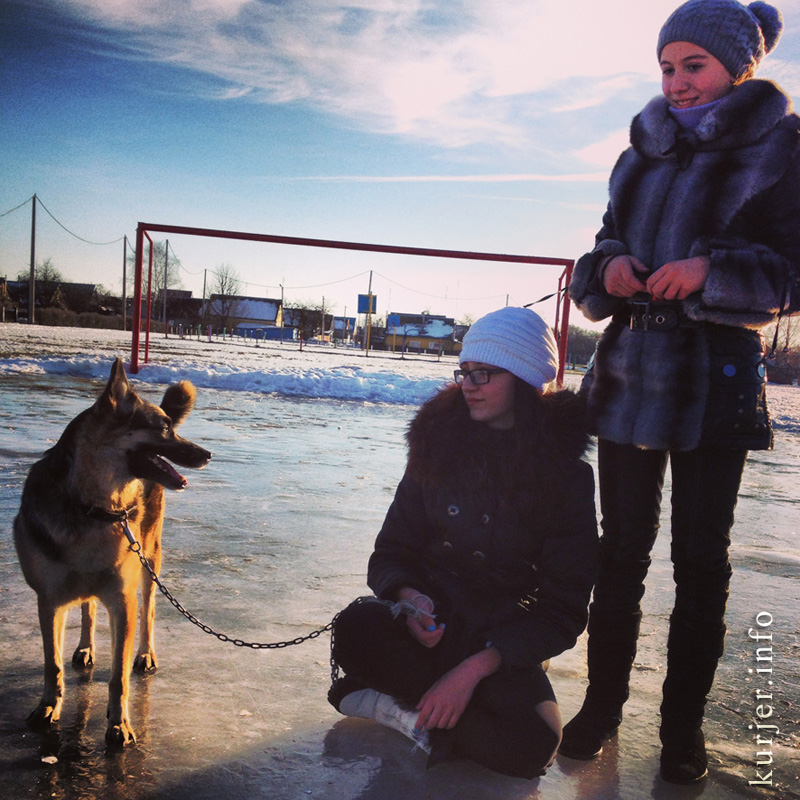 30 декабря. Девочки играют с собакой на ледовой поверхности школьного стадиона. Фото: Алесь Достанко