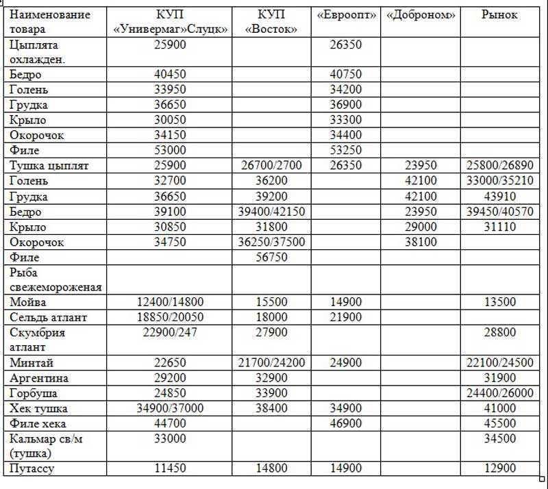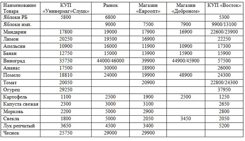 Продолжаем публикации справочного характера, касающиеся цен на продовольственные товары в Слуцке. Для обзора выбраны торговые предприятия: «Универмаг «Слуцк», «Евроопт», «Восток», «Доброном», а также рынок.