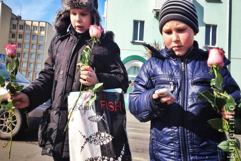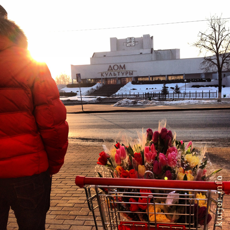 Автобусная остановка. Утренняя тележка, полная тюльпанов. 3 штуки — 33 тысячи рублей, 5 штук — 55 тысяч рублей.