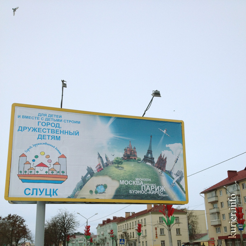 На минувшей неделе в Слуцке на билборде возле «Косого моста» появилась социальная реклама, но отличная от тех, которые вывешивались до сих пор на рекламных площадках города. Этот плакат не является чем-то обобщённым, в стиле «Я люблю Беларусь» или «Курильщики умирают молодыми». Он адресован случчанам и напоминает об одном из статусов Слуцка — города, дружественного детям.