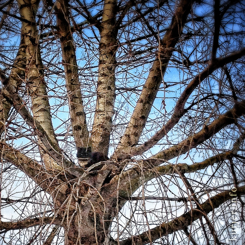 25 февраля. Кот на высоте четырёх метров, забравшийся на дерево. Для холодной поры года такое поведение для кошачьих не типично. Фото: Алесь Достанко