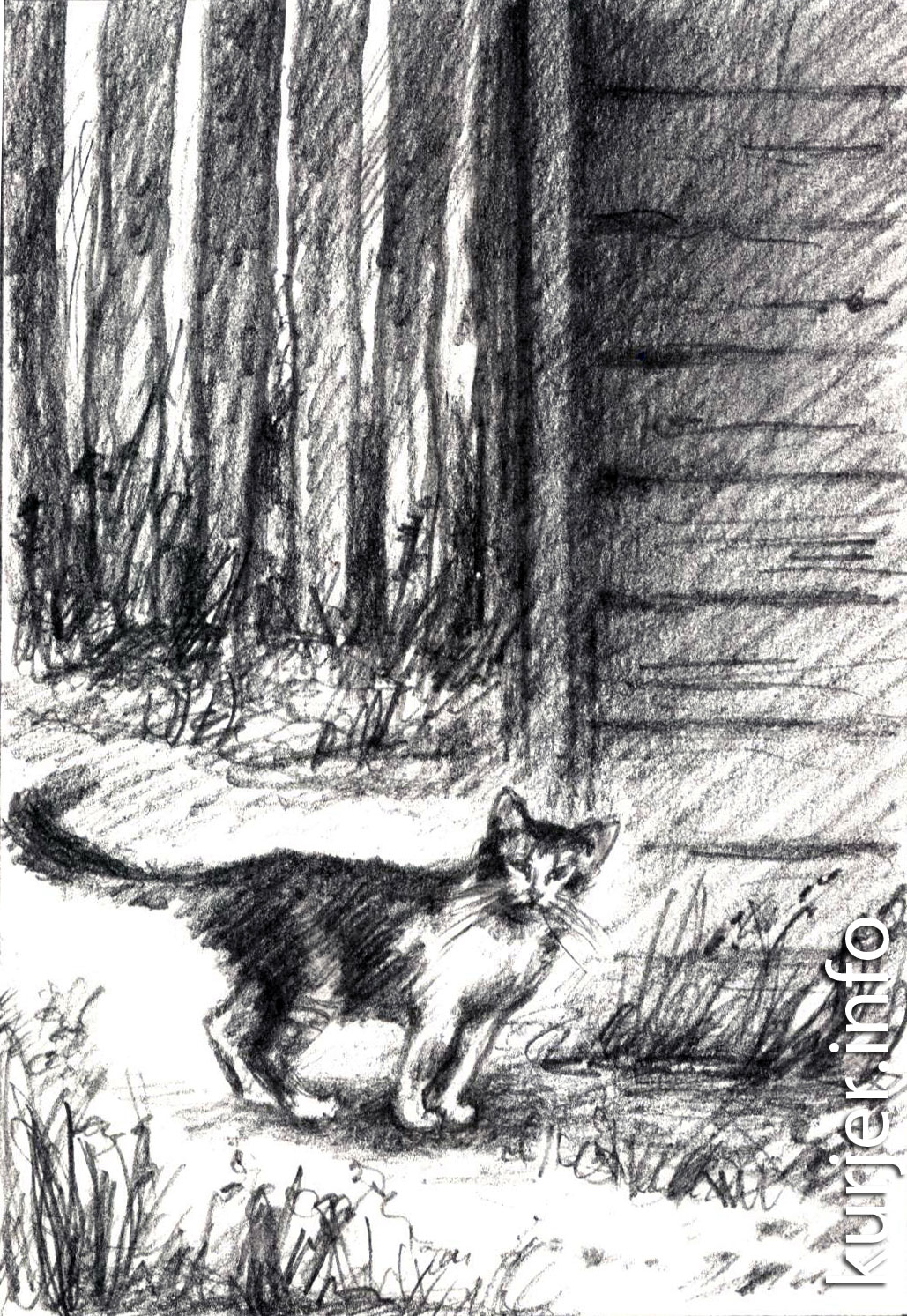 Дзед узяў ключ ад гаража, расчыніў дзверы і ўбачыў, як шэры камячок спрытна схаваўся ў картонную каробку з пад камп’ютара. Кіска цёрлася аб ногі Пятра і аб нечым мяўкала. У каробцы двое малых кацянят стараліся падзяліць кусочак лівернай каўбасы.