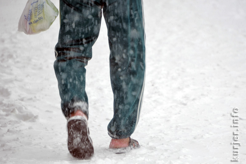 Во время метели в Слуцке ходят в шлёпанцах и делают ямочный ремонт на дорогах